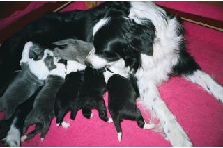 Pentueessa on kolme mustavalkoista narttua ja kolme sinivalkoista urosta.